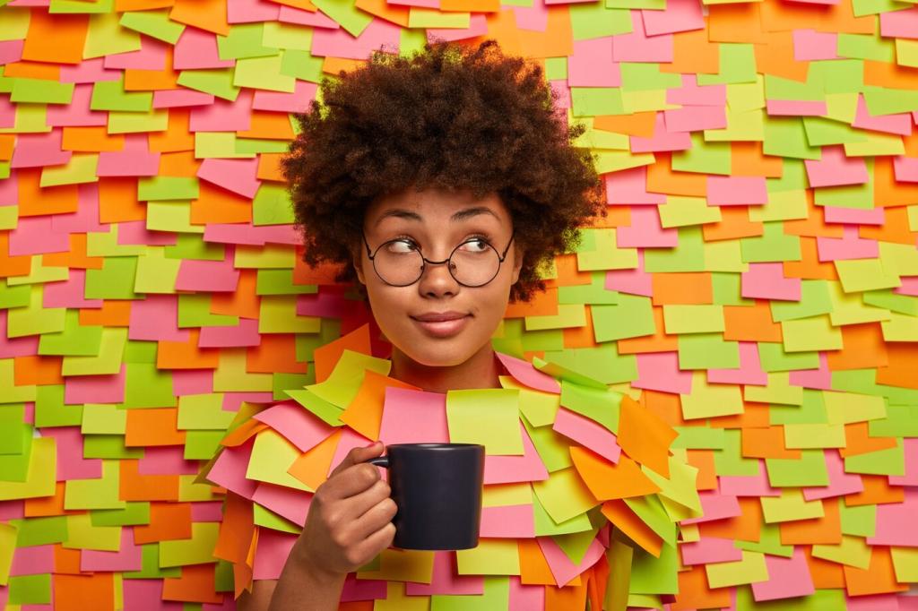 Mit einem leicht feuchten, sauberen Rundpinsel hebst du Glanzlichter aus frischen Lasuren. Ein Naturschwamm schafft organische Kanten. Arbeite in Schichten, pausiere rechtzeitig, und vermeide Rubbeln, das die Papieroberfläche aufraut und Farben stumpf macht.